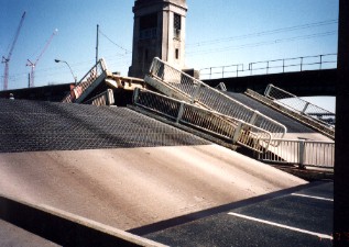 実は運河にかかった橋だったのだ。船が来ると自動的に通行を遮断し、持ち上がるようになって