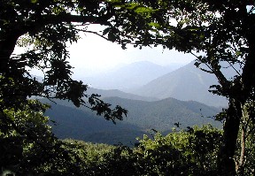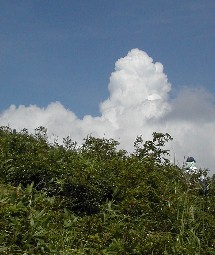 木々の間から近くの山々を望む、山には大きな入道雲が湧いていた ![]()