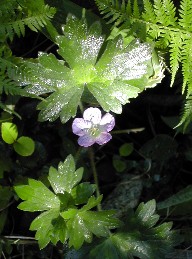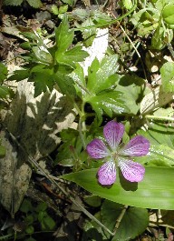 登山道途中で見かけるフウロとゲンノショウコ、よく似ているがフウロは花びらが大きく分かれている かんな流し跡の湿地帯に群生していたサワギキョウ いよいよ坂道にさしかかりました。これまでもなだらかな坂道でしたが、それよりは多少勾配のある道になっていま