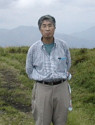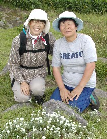 家内と友人(手前の白い花はホソバヤハハコ)、そして私、道後山山頂にて撮影 ![]()