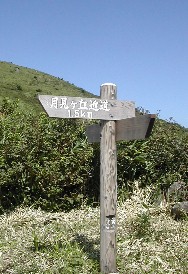 これから道後山の方に向かう標識とワレモコウの彼方に遠く道後山を眺める ![]()
