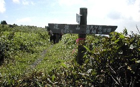 いよいよ山頂付近に近くなった、道後山山頂に立つ標識 ここで大休止としました。早速お弁当を開きます。日陰になるようなものは何もなく直射日光の下ですが、風が