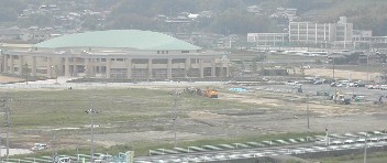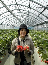この周辺は広大な田園地帯である。左は田畑を見下ろす常山、そして、それに連なる山と田畑。 灘崎町のレクレーション施設(中には風呂やスポーツジムなどがある)とサッカー場(手前の広場、建設中) サウスヴィレッジで一番の人気と言ったら苺狩りではないだろうか。早春から6月頃にかけて温室栽培の