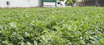 そして、その先にはジャガイモやタマネギの畑が広がっている。場内ではトラックターが引っ張る乗り物