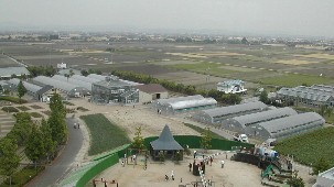 展望塔から眺めた園内の景色、左は芝生が美しい広場、右はイチゴハウスの一部が見えている。 ![]()