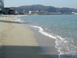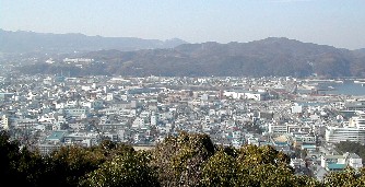 洲本城の城跡から洲本市内を 洲本市にはきれいな海岸があります。大浜公園として海水浴などで賑わうようです。砂浜の一方には古い大きな