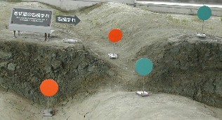震災記念館の大きな風力発電機、記念館の中にはこんな断層が保存されています ![]()