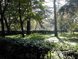 向かった。地図上では確か、この当たりだと思うのだが、塀の中に見えるのは鬱蒼と木々が茂った森だけで