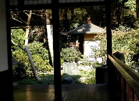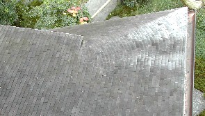 縁側から見た離れの茶室、右は二階から見下ろした一階の屋根、木の板を重ねた作った屋根は美しいカーブを描いていた。 ![]()