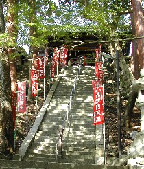 毘沙門堂への長い石段、そして境内へ、お堂の正面には大きな提灯が下がっていた。境内を彩るドウダンツツジの赤が鮮やかだった。 ![]()
