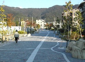 商店街の手前にある観光案内所のきれいな庭と、その裏にある石畳の散歩道。桜の頃はさぞかし賑わう事だろう。 平等院鳳凰堂