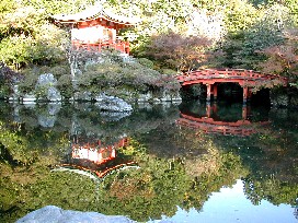 山近く、境内の一番奥にある弁財天をお祀りした小さな赤いお堂、その手前にある赤い太鼓橋、これらが池に映りとても美しい。 紅葉はなくとも絵になる景色だ。 右の建物はお坊さん達の生活しているところだろうか、ここも手入れの行き届いた庭がきれいだ。 早朝からの長い旅の一日目は醍醐寺で終わろうとしていた。醍醐寺前のバス停でバスに乗り京阪電鉄の