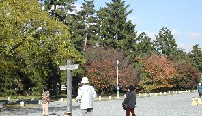 御苑内の銀杏の黄葉は始まったばかり、右は松林の広がる芝生の庭園。 京都御所から少し離れたところには、天皇を退位した上皇が住んでいたという大宮御所があった。退位後