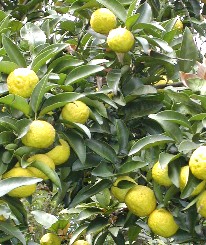 時を知らせる鐘を撞く若いお坊さん、右は境内の片隅にあったユズだろうか。 宇治神社、宇治上神社