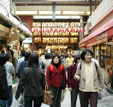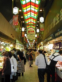 新築の京都駅、大きな鉄骨の構造物が珍しい。そして錦市場、小さな商店が狭い道の両脇に建ち並んでいる。 この日も大変な賑わいだった。 ![]()