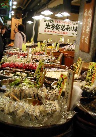 京都市民の台所であり、この日も大変な賑わいだった。野菜、魚、漬け物等の店が狭い道の両脇に並んでいた。