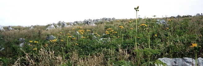 カルスト台地は高原のお花畑だ 台地には夏の花が咲き乱れ牛が草を食んでいる。露出して雨に削られた石灰岩が