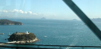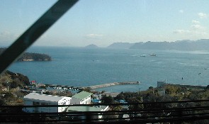 瀬戸大橋を渡るマリンライナーの車窓から瀬戸内海を眺める。 ![]()