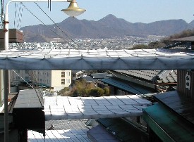 いつも大勢の参拝客で賑わう門前町。長い石段の両脇には土産物屋が軒を連ねている。 アーケードの上からは讃岐平野が見えている。 ![]()