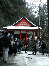 幹周りは何メートルあるのだろうか。苔むした巨大なクスノキが何本も私達を見下ろしていた。 御覧のように白峰神社の屋根には前の日に降った雪がたくさん残っていた。 奥社の境内には雪がまだたくさん残っていた。そして凍って滑りやすくなっていた。雪景色の金刀比羅宮