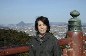 御本宮は大勢の善男善女で賑わっていた。境内にて遠く讃岐富士を背景にパチリ。 ![]()