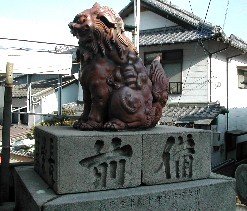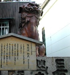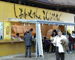 備前焼の狛犬(この付近から大門までを一の坂という) この備前焼の狛犬は備前岡山「長栄講」の人々によって奉納されたもの。 木村長十郎他六名の職人によって製作された。 石段の両脇、御本宮に向いて左右一対となっている。 お礼を言って外に出ると、何かしら香ばしい匂いが流れてきた。饅頭や煎餅を焼いている店からのもの