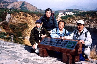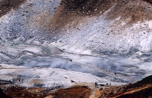 ミクリガ池をバックに、深い谷底からは硫黄の匂いが上がってくる 遊歩道もきれいに整備されており、道の両脇には這い松をはじめとする高山植物が地を這うように覆っています。ここら