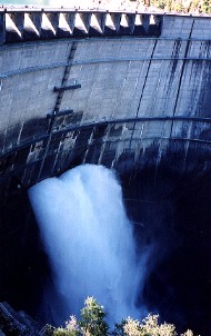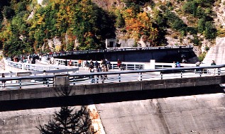 ダムの堰堤を歩く人達、水煙を上げてほとばしり落ちるダムの水 ダムのほとりでの朝食
