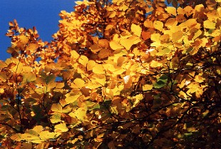 黄色等、色とりどりに色づいています。それらの葉っぱが真っ青に澄み切った空からの日の光を浴びて、それは色鮮やかに
