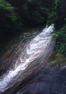 さらさらと流れ落ちる「雪輪の滝」、そして目の前にそそり立つように迫る山並み。 谷の周辺は鬱蒼たる森林だ。 ![]()