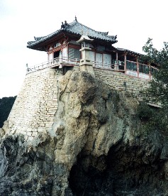 で多くの参拝者があるところです。お堂は海に突き出た高い崖の上にあります。海岸にせり出した岩石の上に更に石垣