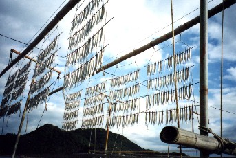 冬の風物詩とも言うべき干し魚 海岸に足を運びますと冬の風物詩ともいうべき魚の干物が所狭しと並べられています。サヨリ、デベラ(小さなカレイ)、