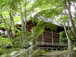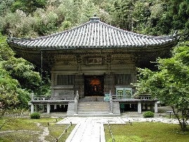 今、金堂は鉄筋コンクリート製の建物の中にあります。新緑のモミジに囲まれたお堂の一つ。 ![]()