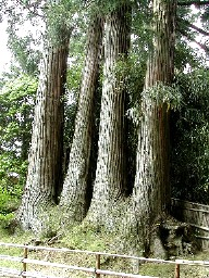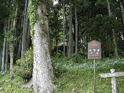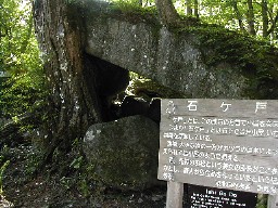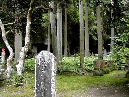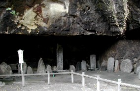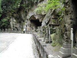 鬱蒼とした杉木立で一方の岩壁には大小の洞窟がうがたれていました。洞窟は穴だけのものもあれば