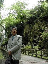 洞窟群の前にて撮影。洞窟には長年月の線香や蝋燭の跡が黒く残っていた。 私達は瑞巌寺の境内だけを見て隣にある伊達政宗の嫡孫「光宗」の菩提寺「圓通院」に入りました。