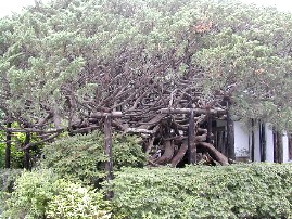 また、こんな石庭もあった。圓通院の山門。 圓通院からほど近いところにこんなシンバクの大木があった。 よじれた枝が絡み合って不思議な形を作りだしていた。 空は今にも降ってきそうなくらい暗くなっていました。大急ぎでバスに戻り、蔵王高原に向かいました。