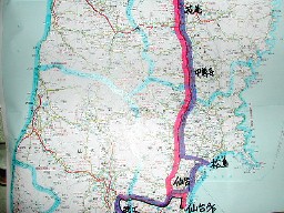 仙台空港は近代的でモダンな建物である。 空港に着いて間もなくガイドさんが迎えに来てくれた。 バスに乗ると早速、道路地図で今回の観光コースの説明があった。 ![]()