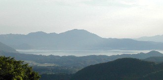 ところの駐車場から田沢湖がよく見えました。夕暮れ近い逆光の中で湖面が白く光っていました。
