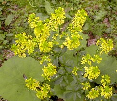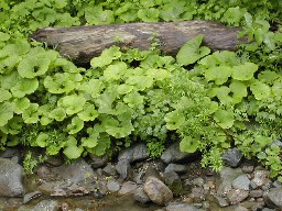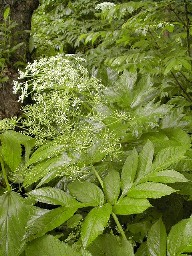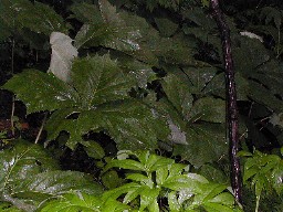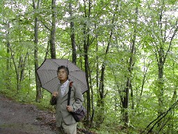 フキ等に混じってヤグルマソウもあった。葉の大きさにも驚かされた。 ぶな林の中で傘をさして。 ![]()