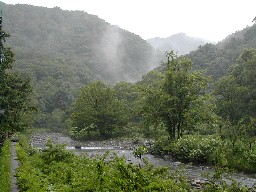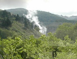 又、流れる水の酸が強く河原の石は鉄錆で赤くなっていた。 山の中からは温泉の湯煙が上がっていた。 ![]()