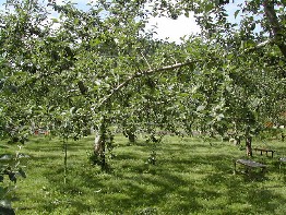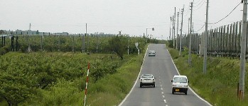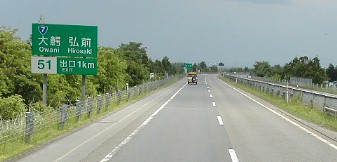 道路標識にあるように大鰐、弘前インターチェンジで一般道路に下り、右の写真のように広大なリンゴ畑の中を走った。 バスは鹿角八幡平インターチェンジから再び高速道路に入り、大鰐弘前インターチェンジで一般道に