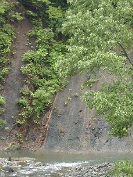 川のほとりに露出した地層、激しく隆起したことを物語るように縦になっていた。 右の花は名前を聞いたのだが忘れてしまった。 ![]()