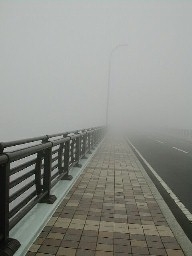 そして、八甲田の展望を楽しみにしていた城ヶ倉大橋では御覧のような濃い霧に閉ざされてしまった。 周辺のぶな林さえもこんなに霞んでいた。 そして山頂を越え太平洋側に入ると一挙に霧は晴れ素晴らしい青空が待っていました。日本海側は深い