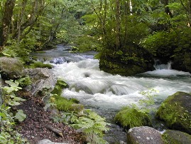 教えて貰った白神山地の入口当たりまで歩いていくことにしました。近くを流れている川は水嵩が増し、