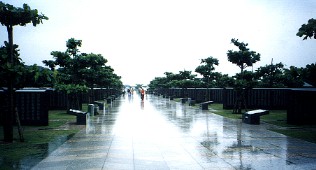 激しく降りしきる雨の中を、石碑に刻まれた戦没者の名前を読んだり、公園の先端部まで行って、