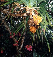 観光の途中立ち寄った泡盛の工場でのひとこま 右は島内至る所に見られるあだんの実や南国の花々
