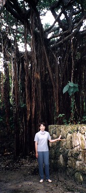 左は沖縄の代表的な植物「ガジュマル」太く大きな根が無数幹から地面に下がっている 右の二枚は内地では見たこともないような南国の植物