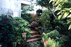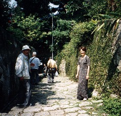 沖縄戦で唯一戦禍をを免れた場所で石畳が続く坂道 道の両側の民家の庭は手入れが行き届いており美しい花が咲き乱れていた 観光バスは首里城を後にして一路那覇市内へ向かう。那覇では最後のショッピングと昼食を