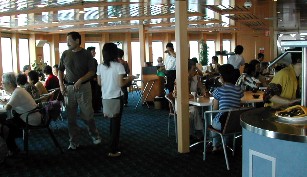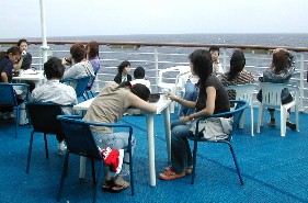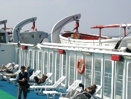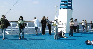穏やかな天気に恵まれ、屋上の船首デッキでは三々五々景色を眺め、日光浴をする人や読書をしている人がいた。