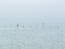 かな資源である蟹や魚を獲る網だろうか。網のそばには小さな番小屋があり人の姿があった。